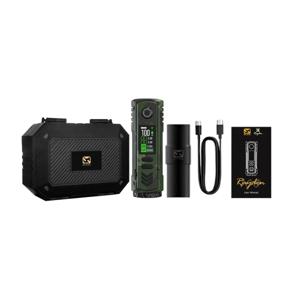 Rayden je poháněn baterií 18650 nebo 21700 (není součástí balení) a dosahuje výkonu až 100W. Moderní chipset XT ULTRA 1.3 umožňuje rychlou odezvu, různé režimy (Soft, Norm, Hard, Bypass) a personalizaci barev. Díky on/off přepínači je ovládání jednoduché a praktické.